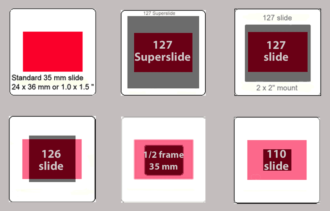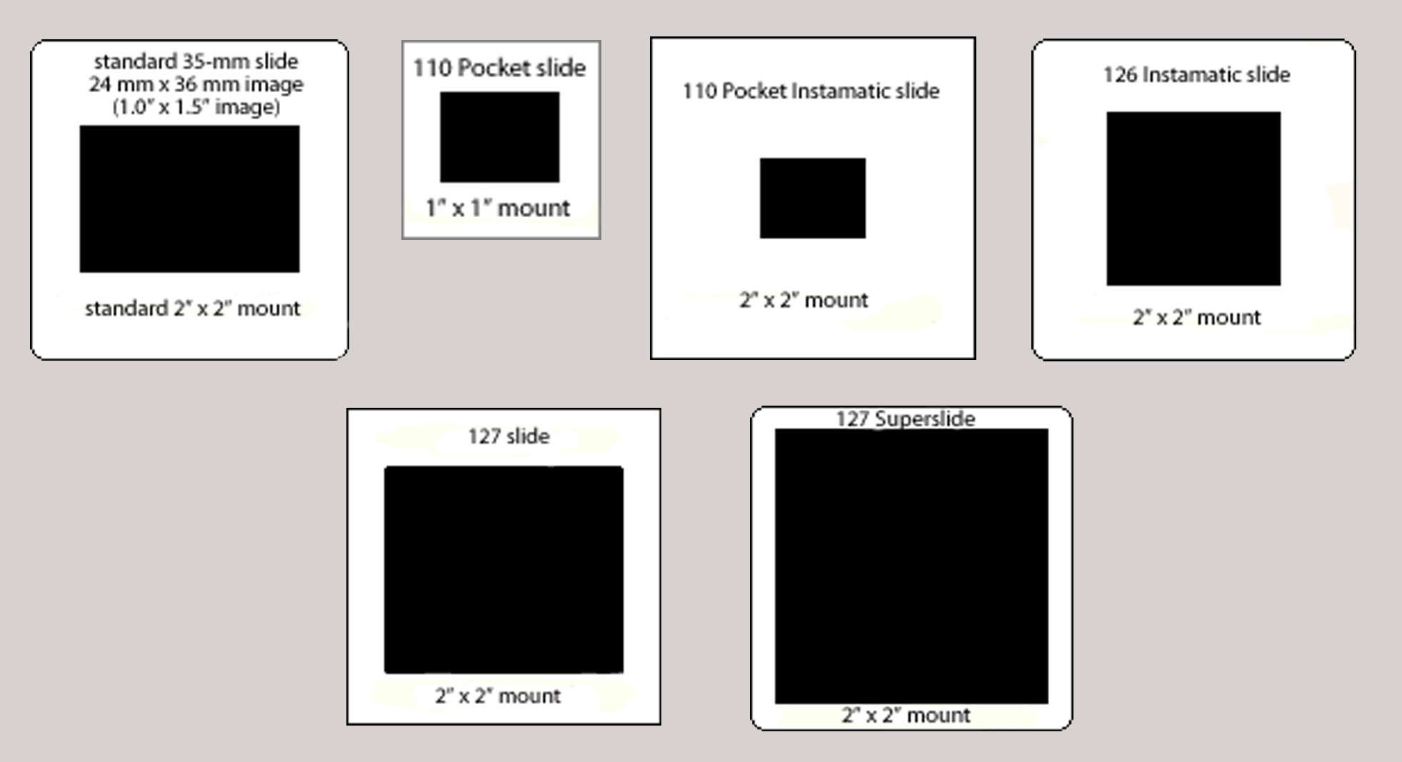 Different sizes of original slides or negatives will either be cropped in one or both dimensions if they are larger than the 1.0″ x 1.5″ image area of a standard 35-mm slide or negative. If they have a smaller image area, there will be a border on at least two, likely all four, sides. Please see the examples (below) of different sizes of slides/negatives for more information.
